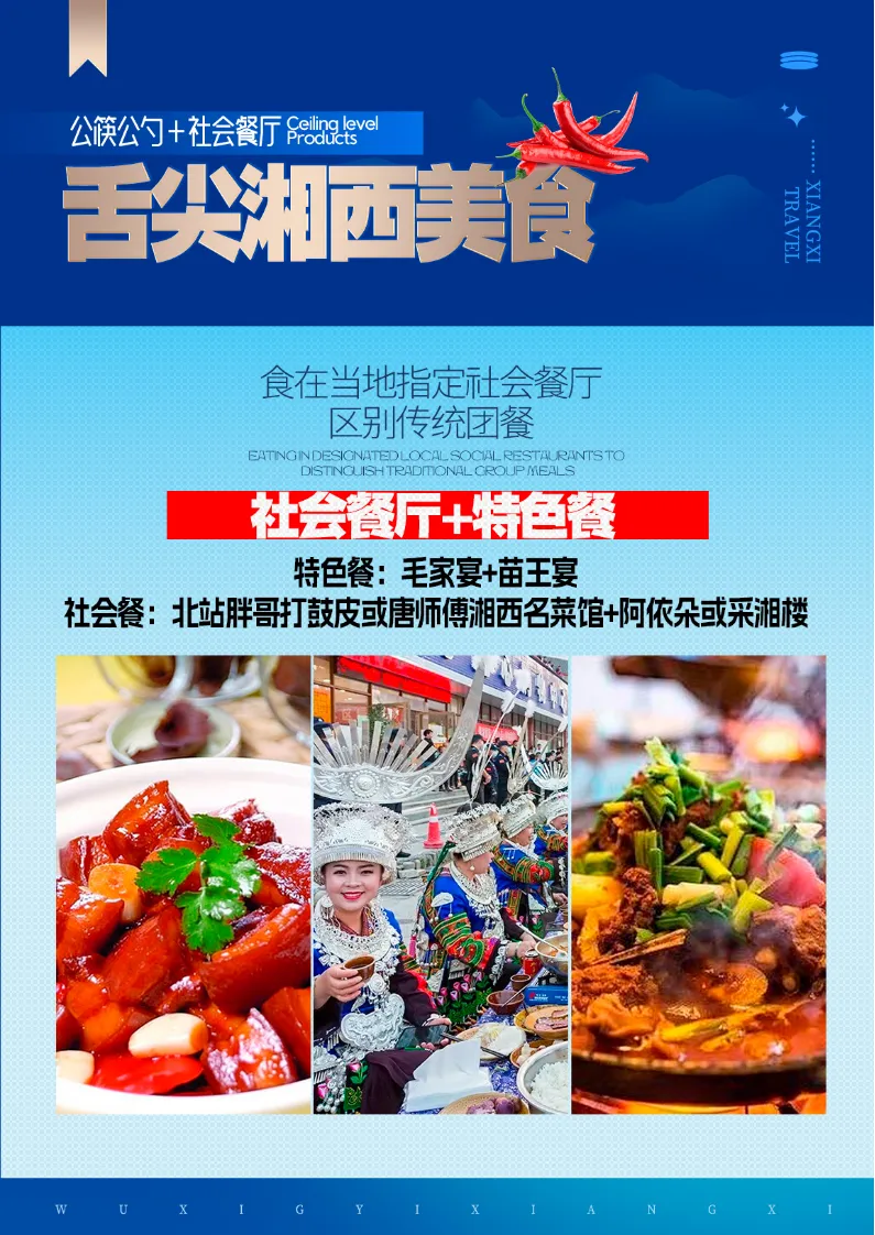 早餐后BUS前往参观【墨戎夯吾苗寨】苗寨是美丽峡谷中古老而神奇的苗寨,是镶嵌在神密湘西的一朵奇葩。苗寨居住着百余户苗民,至今留存着千年古俗。是天下闻名的苗鼓之乡,男女老少皆爱“跳鼓”,曾出过五代苗鼓王。繁衍于斯的苗族同胞,千百年来安居乐业,他们讲苗语,穿无领绣花衣,以歌为媒,自由恋爱;晨昏作息,等闲生死;歌舞沉酣。姑娘喜欢用银饰打扮自己,男人爱结绑腿,吹木叶,喜武术。他们自己种棉,养蚕纺纱织布,用古老的方法榨油,造纸,碾米,织布,用筒车提水灌田。(苗寨属于湘西落后地区,景区内有政府扶贫供销社,请根据自己需求选择商品)