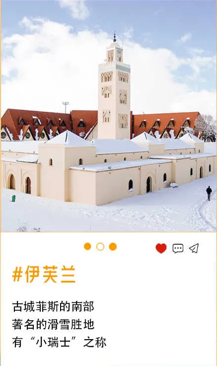 途径摩洛哥阿特拉斯山脉中部的伊芙兰,位于古城菲斯的南部,距菲斯63公里。这个只有13000人的小镇是著名的滑雪胜地,有“小瑞士”之称。那些高高耸立的三角形屋顶,象一座座阿尔卑斯山式农舍;精心修剪过的草坪上,鲜花盛开,房前屋后绿树葱葱,给游人的第一印象就是仿佛进入了一个瑞士村庄。在城市的中心有个大湖,周围建了许多花坛和长椅,湖光山色,风景怡人。抵达菲斯晚餐后入住酒店休息。