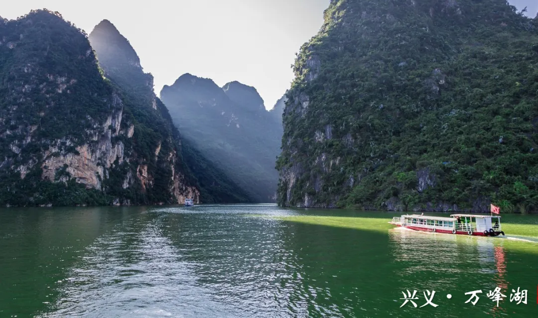 坐船游览贵州高原第一大湖---【万峰湖】(游览时间约1.5小时,游船80元/人必须自理)万峰湖是国家重点水电工程--天生桥高坝电站建成蓄水后形成的人工湖,烟波浩淼,湖光潋滟。湖内上千座山峰构成上千个全岛或半岛,景色十分迷人是全国五大淡水湖之一。万峰湖因湖四周万峰环绕,故得名万峰湖,蓄水102亿立方米,水面达816平方公里,迂回环绕在黔、桂、滇三省(区)之间,沿岸民族山寨,独特的民居,诱人的风情,还有那少数民族姑娘们的服饰、头饰以及那撩人的情歌,都值得您到此一游。