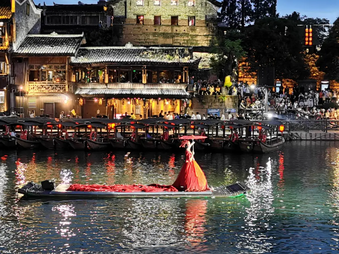下午赴曾被新西兰著名作家路易艾黎称赞为中国最美丽的小城—【凤凰古城】(218KM、车程约3小时、接驳车28元/人已含):参观《湘见沱江.水上翠翠婚礼》(赠送项目,如停演或天气原因取消不做等价交换):坐上乌篷船,听着舩公的号子,看着两岸已有百年历史的土家吊脚楼,别有一番韵味,后可欣赏沱江美丽的夜景,可自行漫步沱江,燃放许愿灯,或约上三五好友前往沱江边上酒吧畅饮当地胡子酒,品味独特的苗疆风情,一切烦恼都会随风而去.....