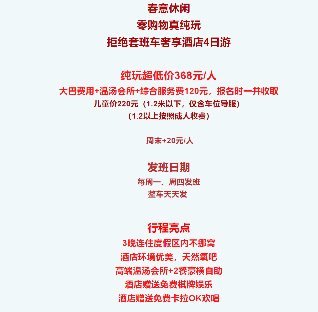 ◆1.2米以下儿童须买儿童价268元/人(只含车位、导服),产生其它费用请自理!◇以上线路为散客综合报价,房差只补不退;
