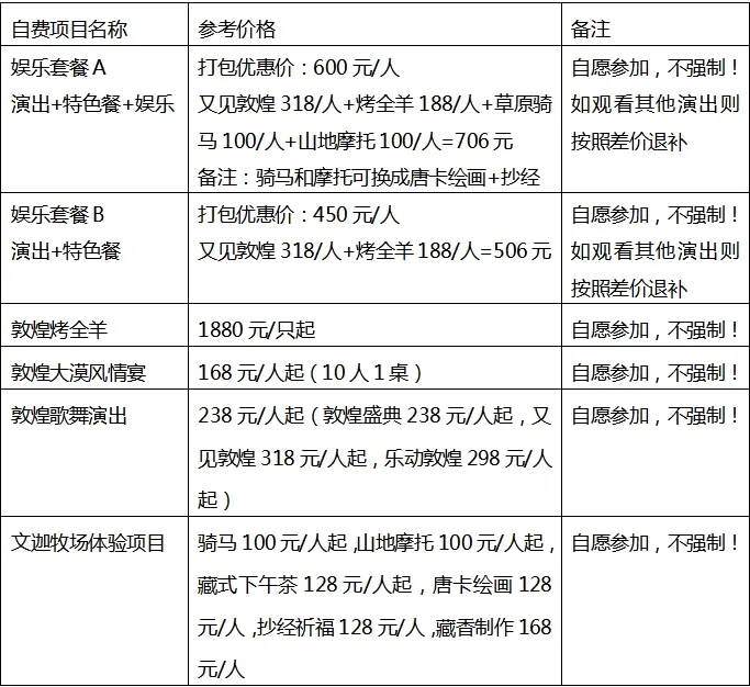 备注:因莫高窟景区每日限量发售A类正常票(8个实体洞窟+数字影院+摆渡车),待A类正常票售罄后再执行发售B类应急票(4个实体洞窟+摆渡车),若安排A类正常票,请团友现补138元/人门票差价;对于莫高窟A类票和B类票都无票的情况,退还莫高窟B类门票自由活动或安排西千佛洞,请周知!