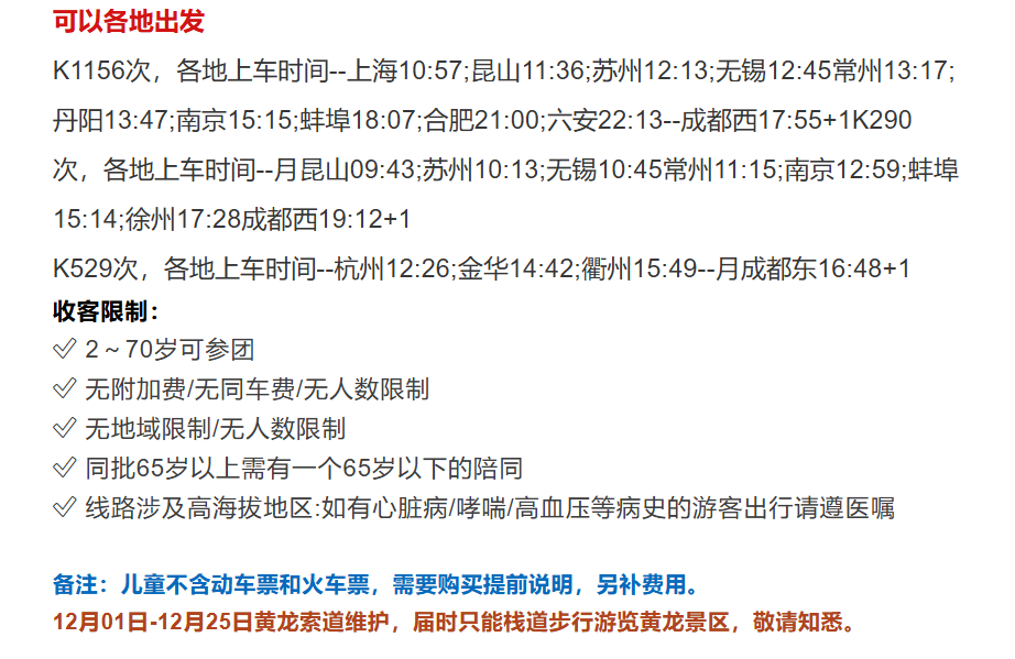 注:如有特殊情况不上黄龙需提前一天告知导游,当天临时不去费用不退。