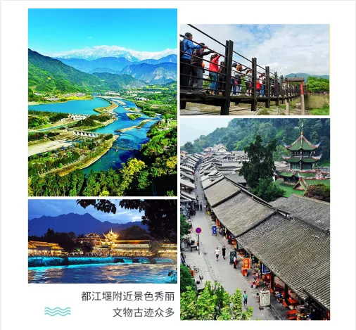 方案一:乘车出发前往游览【都江堰】(含门票,不含观光车及耳麦35元/人、玉垒阁观光扶梯40元/人需自理)—— 游览时间约120分钟 | 距离约50公里 | 车程80分钟