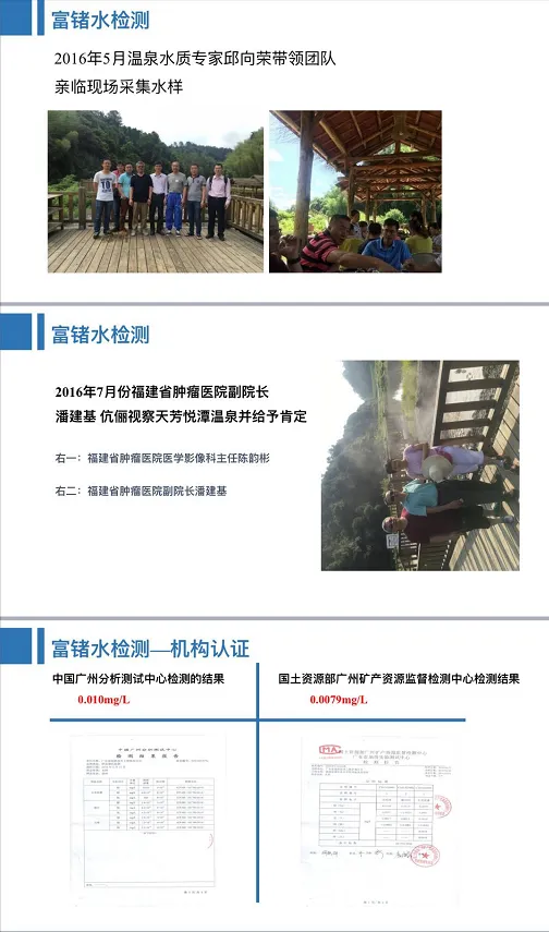 天芳悦潭温泉度假村被福建省地质工程勘察院评为★★★★★级温泉,中国唯一温泉水富含珍稀"锗"元素的天然温泉,经国土资源部、中科院国家级检测中心检测出天芳悦潭温泉水富含锗元素,堪与法国卢尔德圣泉媲美。卢尔德圣水以其富含"锗"元素治愈数以千万患者的疑难杂症、拯救和延长生命,已成为欧洲最大的基督教朝圣的地方,"锗"元素被医学专家誉为二十一世纪的救命"锗"。属世界级的温泉。周围群山环抱,山峦叠翠,鸟语花香,是温泉旅游度假的极佳场所。