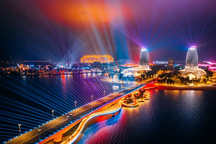 【海花岛灯光秀】:欣赏顶级声光电技术打造的光影盛宴,绚丽夺目的灯光与美轮美奂的建筑交相辉映,灯光璀璨、流光溢彩。(表演时间及地点以当天景区对外公布为准)。