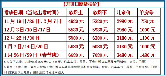 2、专列由哈尔滨发车,以上报价包含上海-哈尔滨往返硬卧,按1000元核算,如需升级软卧或飞机,请按实际补差价!