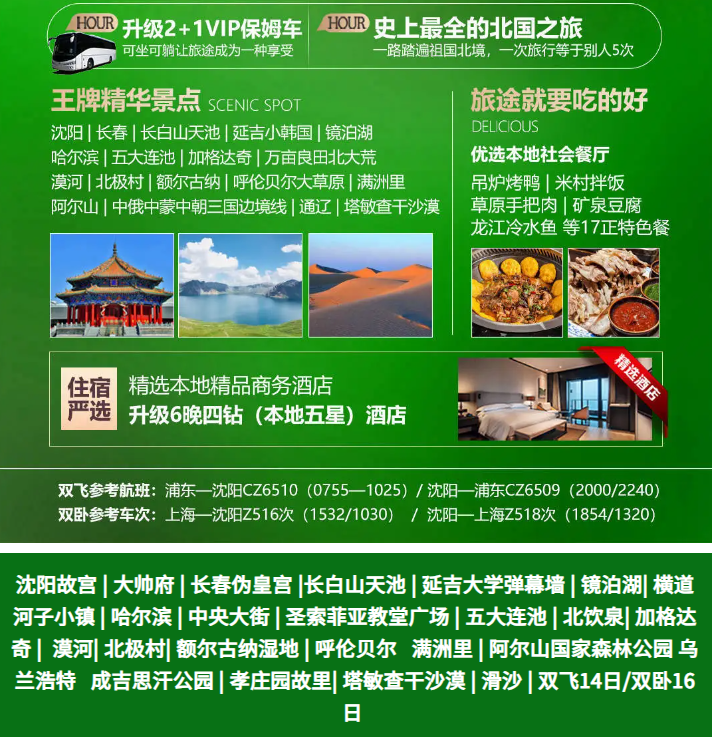5、导游: 全程中文优秀导游服务,因天数太长,为分区间导游。(请注意:因东北跨度大,部分区间服务是服务领队)