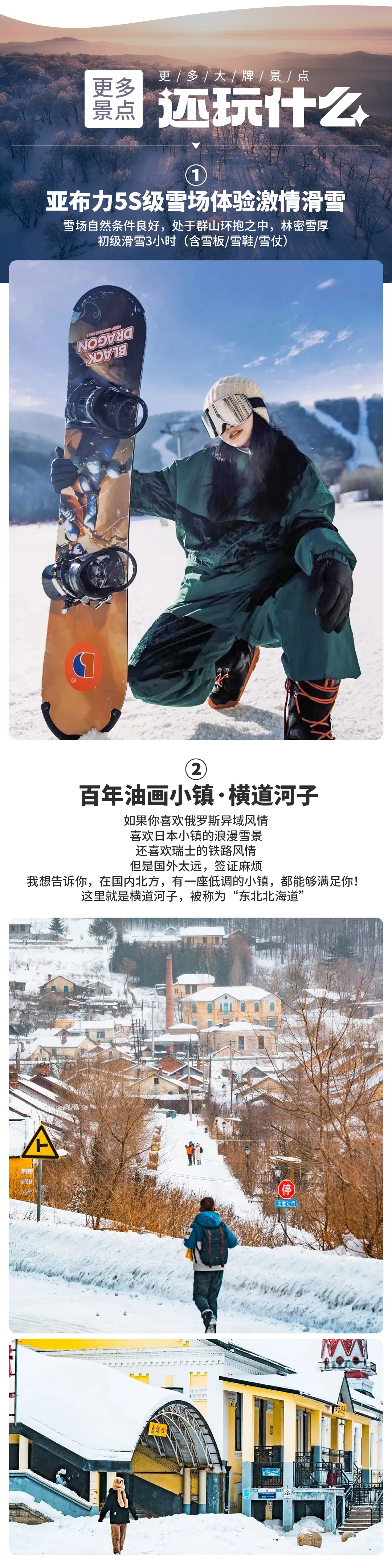 6、关于自费:东北的娱乐项目较多,主要在亚布力、雪乡、长白山。产品分为纯玩产品与自费产品,自费产品中的自费项目会披露在产品推荐项目中,自愿消费不强制;不参加的客户,请在景区附近自由活动等待。