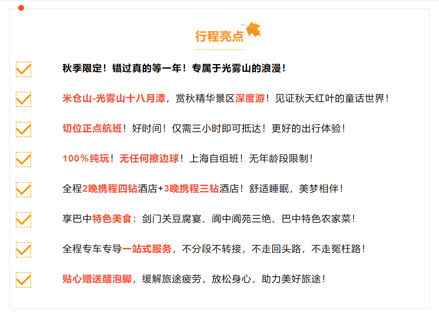 →早餐后车赴光雾山旅游区,游览有“中国红叶之乡”和“天下红叶第一山”美誉的【光雾山大坝景区】(又名米仓山国家森林公园景区)(约5-6小时),光雾山红叶集中展现在米仓山景区,米仓山680平方公里的山间,一到深秋,群山巍峨间层林尽然色,山道上落满红叶,雄奇峰岭上殷红与黄绿层叠交错,像是画家不小心打翻了调色板,红叶主要参观点有〖天然画廊〗、〖黑熊沟〗、〖大小兰沟〗、〖香炉峰〗(有索道需自理)。被誉为“亚洲最大红叶观赏区”,180平方公里的彩林如打翻的调色盘,红枫似火、银杏鎏金、青松苍翠,徒步栈道穿梭其间,随手拍都是风景大片。