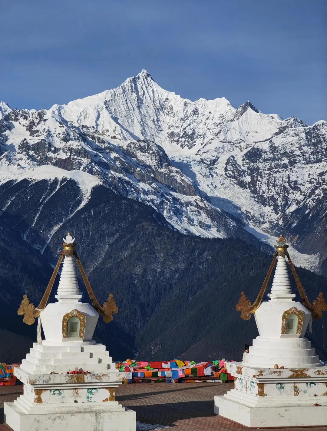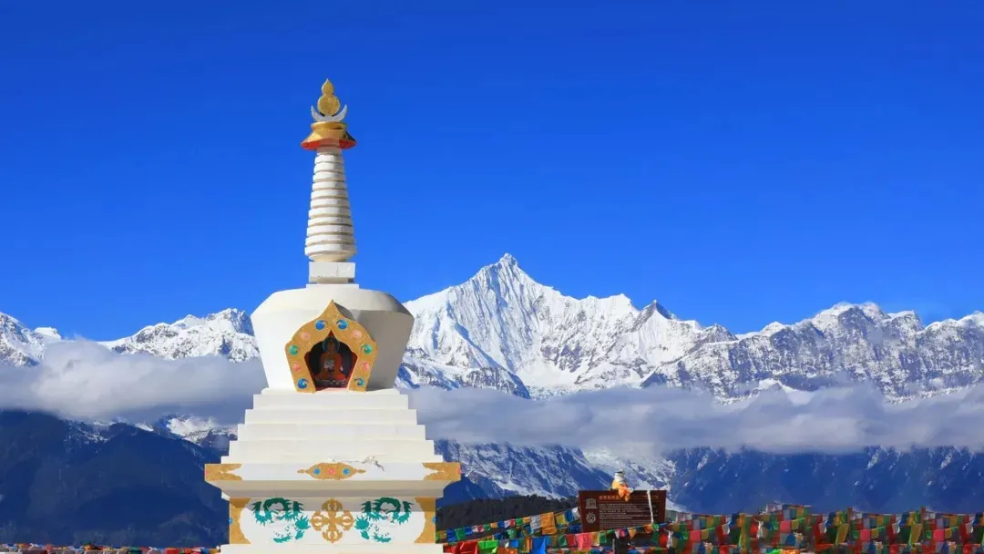 早餐后拍摄【梅里雪山日照金山】,梅里雪山又叫太子雪山,有十三峰称太子十三峰。观景台上的白塔与雪山遥遥呼应。万丈金光从天而降照射在雪山之巅,越过阻碍突然照射在雪山顶上,然后逐渐扩大,形成绝美的“日照金山”的自然奇观,是世界上最美的雪山之一,常年云雾缭绕,白茫雪山山顶积雪终年不化,就像一座晶莹透亮的玉柱直插蓝天,巍峨壮丽。