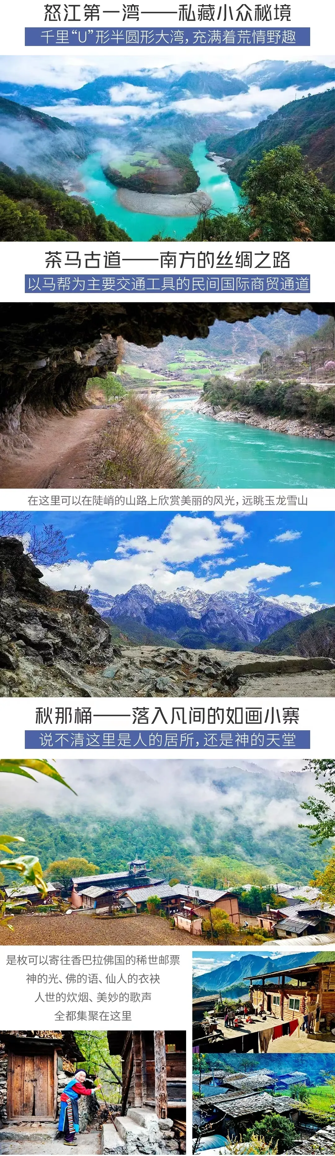 之后游览【秋那桶】(不含倒车20元,需自理【赠送项目已包含】)、【怒族石板房】、【怒江壁耕】,秋那桶村是怒江大峡谷北端的最后一个与世隔绝的村子,也是怒江的终点。