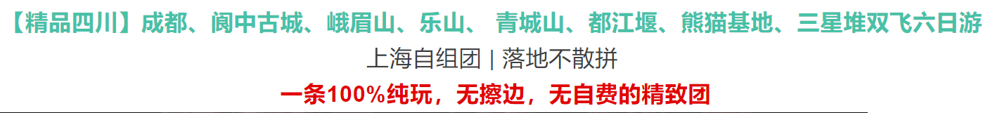 景点:包含乐山大佛、峨眉山、都江堰、青城山、熊猫基地、三星堆博物馆首道大门票,60岁以下需要补门票差额430/人,非上海籍再加105元/人(宽窄巷子、阆中古城等均为行程赠送景点、不游览不退费不做等价交换),特别说明:儿童因不含门票请旅游者于景区售票处自行购买。