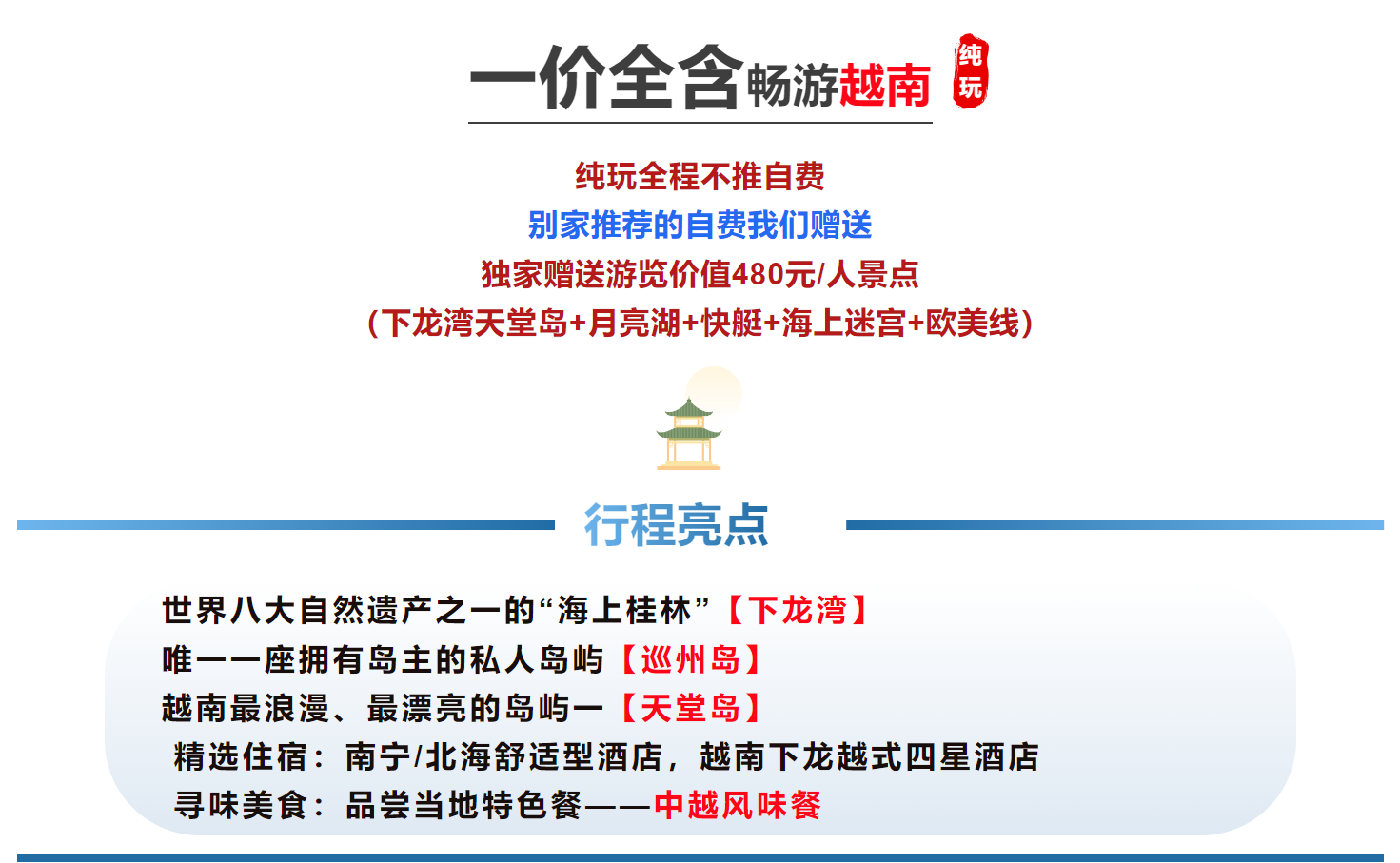 4、【景点】含行程内景点第一道门票及下龙游船船票;不含景区内单独收费的小景区或景区内需要另行收取的小交通费用。