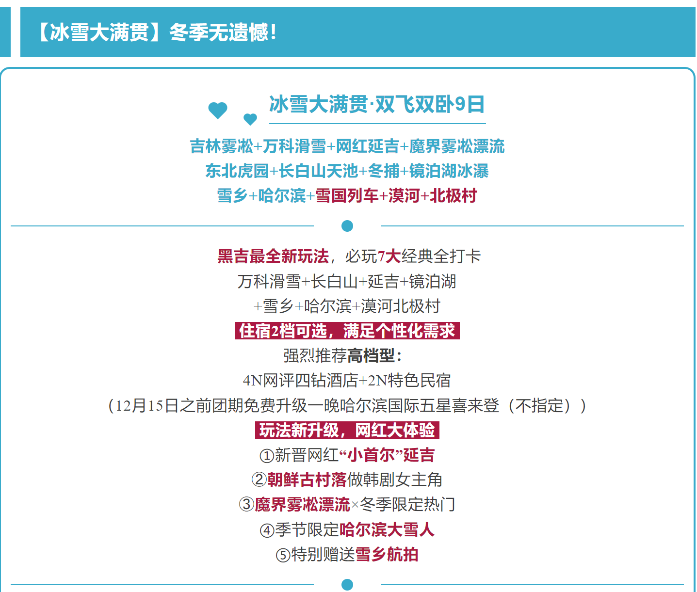 6、关于自费:东北的娱乐项目较多,主要在亚布力、雪乡、长白山。产品分为纯玩产品与自费产品,自费产品中的自费项目会披露在产品推荐项目中,自愿消费不强制;不参加的客户,请在景区附近自由活动等待。