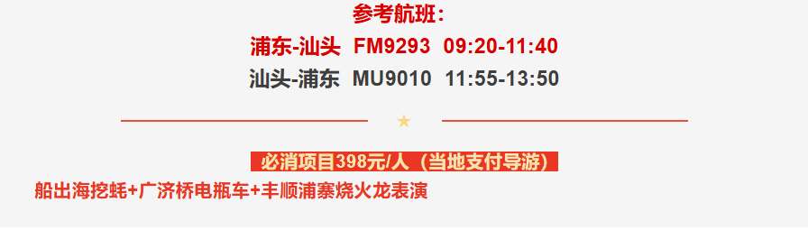 2. 必消项目398元/人(当地支付导游):船出海挖蚝+广济桥电瓶车+丰顺浦寨烧火龙表演;