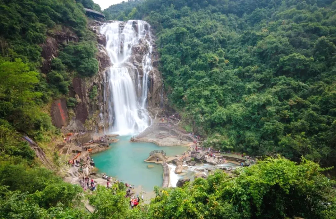 【龙归寨瀑布】位于丰顺县汤坑镇中部偏南,距县城13公里,来源于丰顺第二高、海拔1285米的释迦山脉,被誉为“广东省黄果树瀑布”、“粤东第一瀑”。 它高为125米,飞瀑落差为115米,宽度为62米,集雨面积达到40平方公。