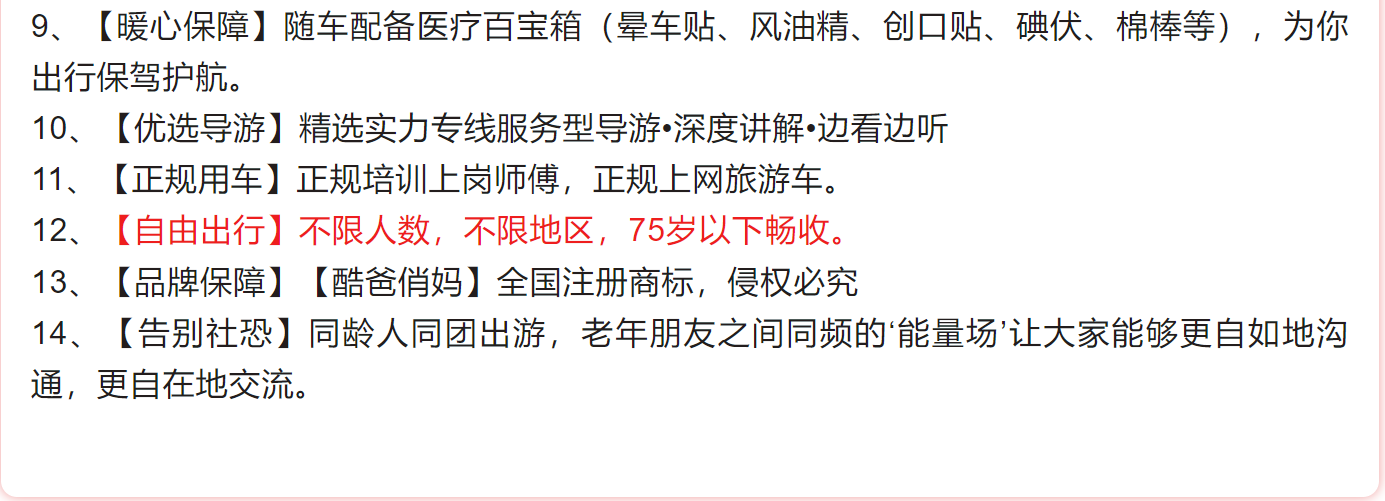 本产品为夕阳红专属产品,因沿途门票老年人有免票或优惠或个人对景点的喜好或身体条件不同,故全程未包含景点门票和景区内配套设施,游客出示自己的证件可享受相应的半价优惠及免票政策。