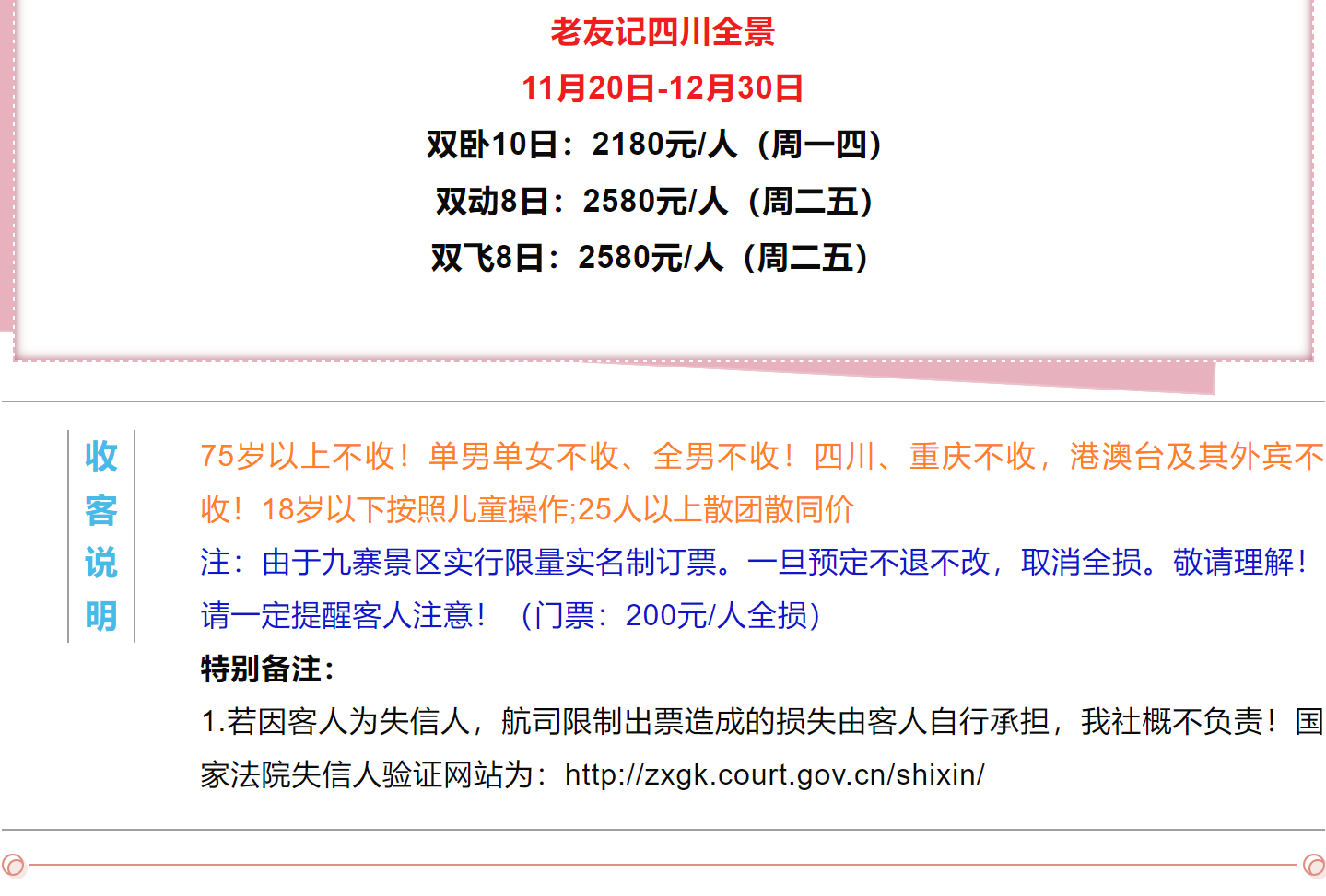 2、部分景区对军官、军残、老年证均可享受优惠政策,请报名时主动提供,若不提供视为无优惠证件