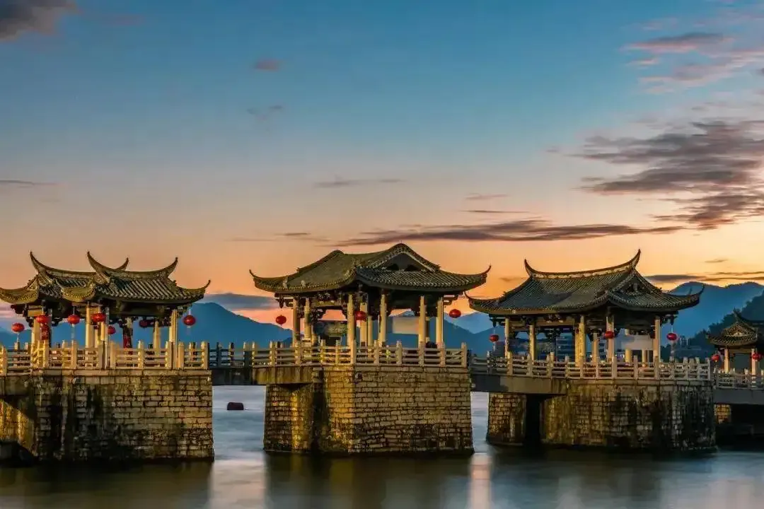 【广济桥】(外观)潮州城七城楼之首。潮州市湘桥区环城东路广济桥对面。又叫东门楼,一二层是广济桥历史陈列馆,城楼建于明代,大概有600多年历史。广济楼是一座3层歇山顶阁楼,仿宫殿式建筑,雄伟壮观,是潮州古城的标志性建筑