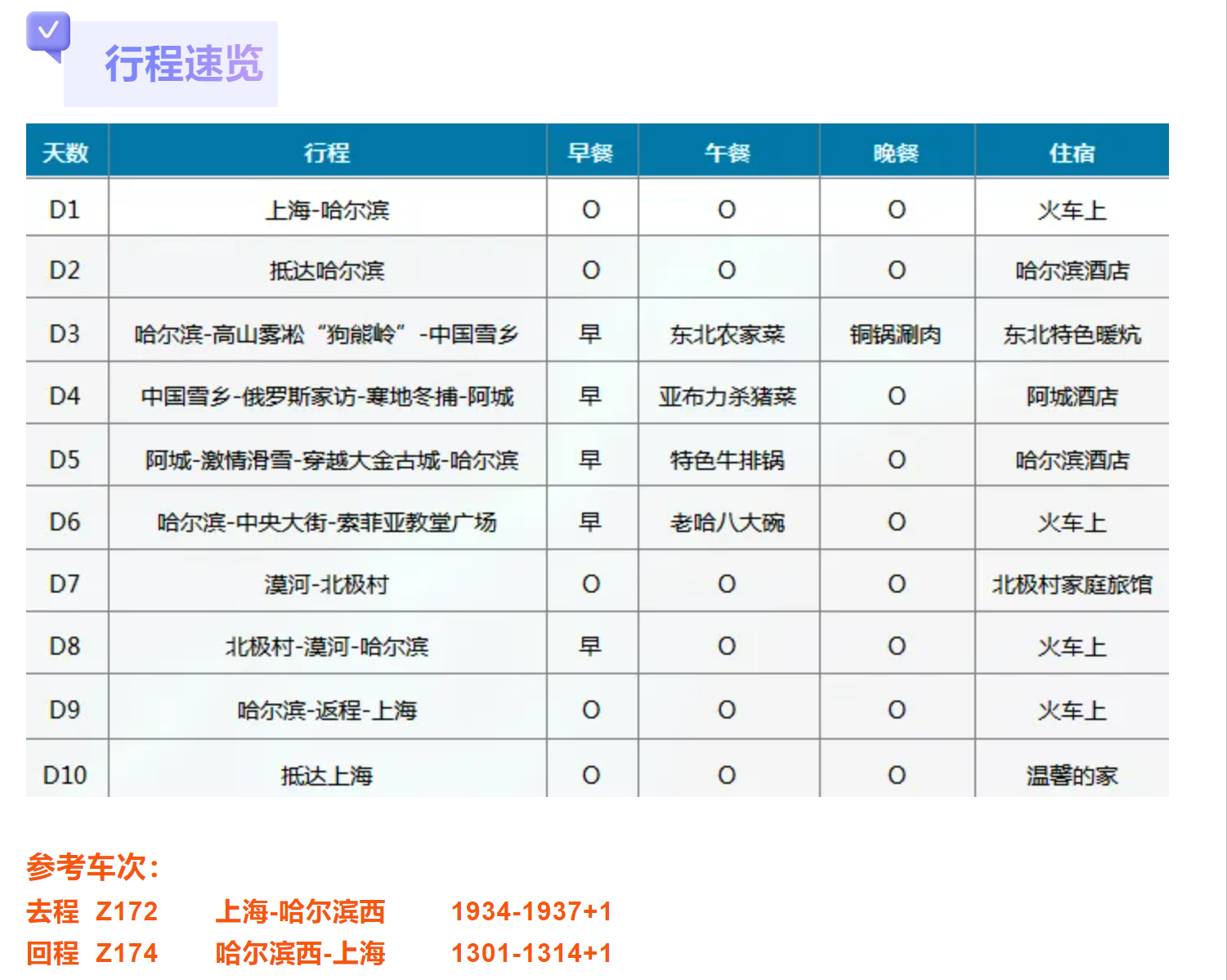 交通:上海-哈尔滨往返大交通;哈尔滨-漠河往返火车硬卧