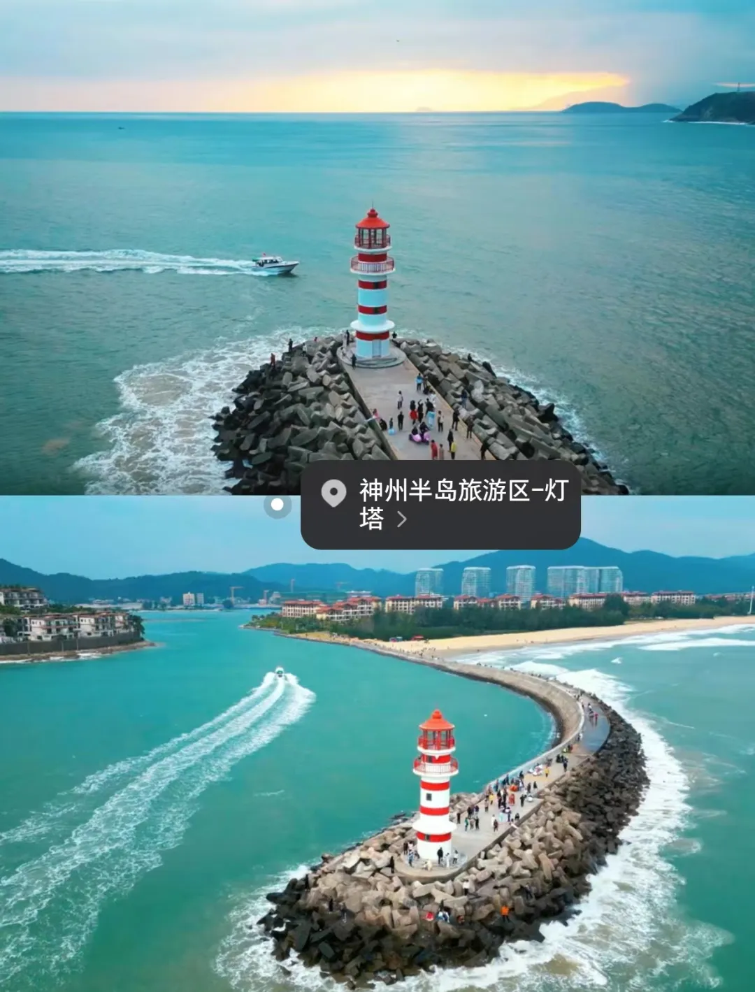 碧蓝的大海,雪白的沙滩,红白相间的灯塔,呈现出多彩梦幻的画面,让人沉浸在一眼天涯的浪漫中。