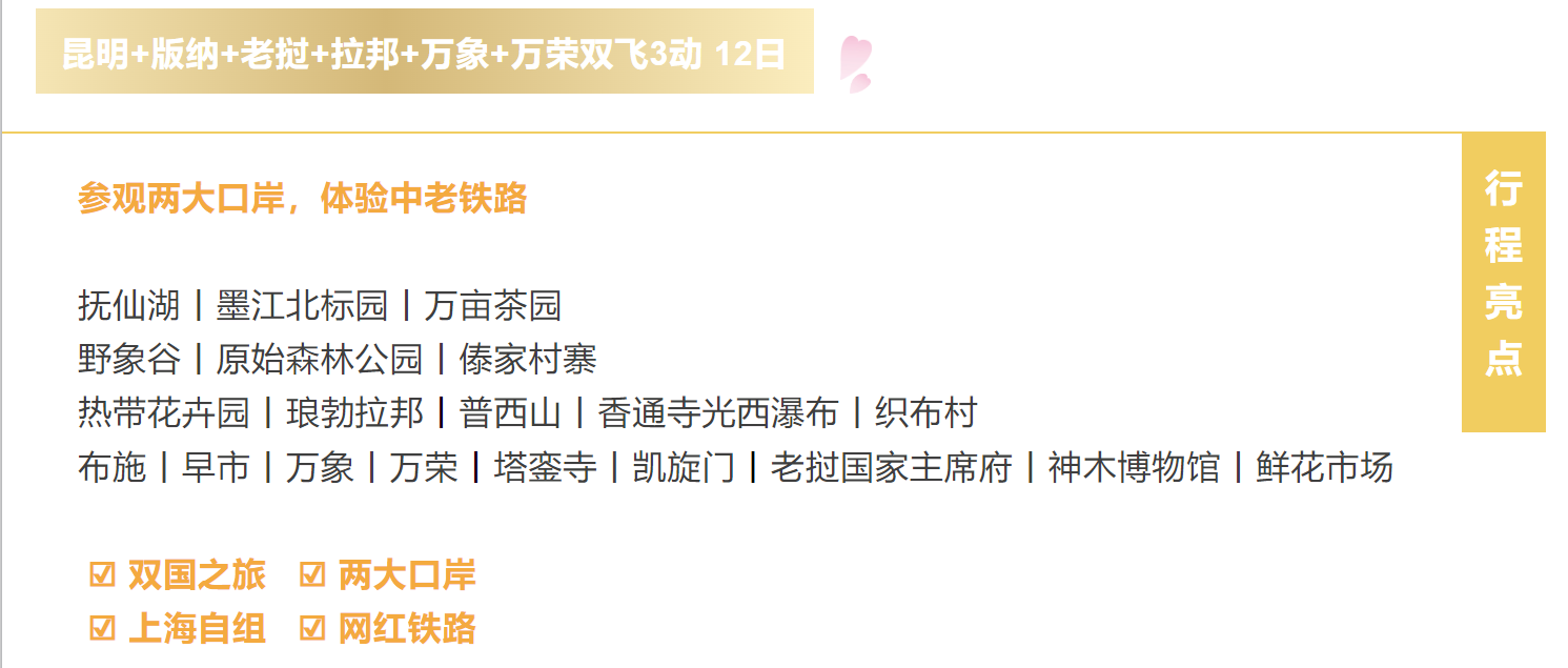 7、老挝交通:版纳-磨丁动车(版纳-磨憨中转磨丁)、万象-昆明南动车(或万象-磨丁中转磨憨-昆明/昆明南动车)、琅勃拉邦-万荣普通列车均二等座(或琅勃拉邦-万荣乘车前往),以及行程中当地汽车、万荣和琅勃拉邦嘟嘟嘟车。