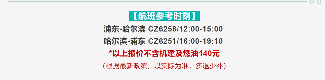 【飞机】上海-哈尔滨,哈尔滨-上海往返机票(不含税,含20KG托运行李) 准确起飞时间以出团团通知单为准;