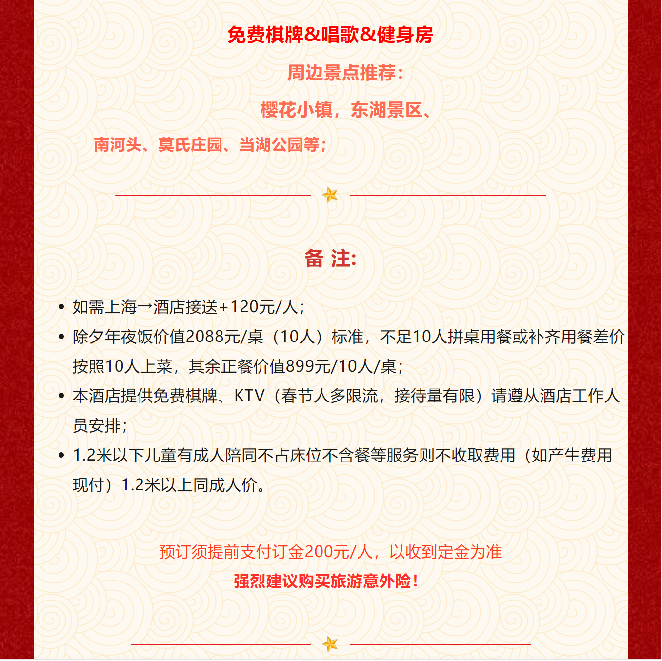 1,春节订单预定量大,需提前预定,付定金200元/位可保留房间;出现单人补房差560元/人/2晚;