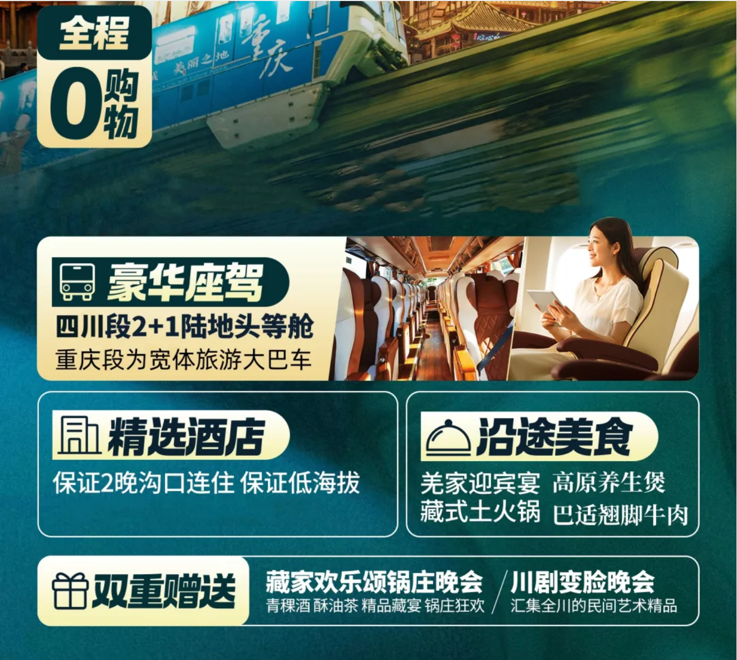 【交通】:上海-成都往返2程机票(含机场建设费、燃油附加费)/火车硬卧(不指定铺位,不指定车厢)/动车二等座,机票不得签转/变更/退票。重庆-成都动车二等座。行程内用车为旅游巴士,根据同团人数安排车型,保证一人一座,不提供座次要求;接送机根据当次航