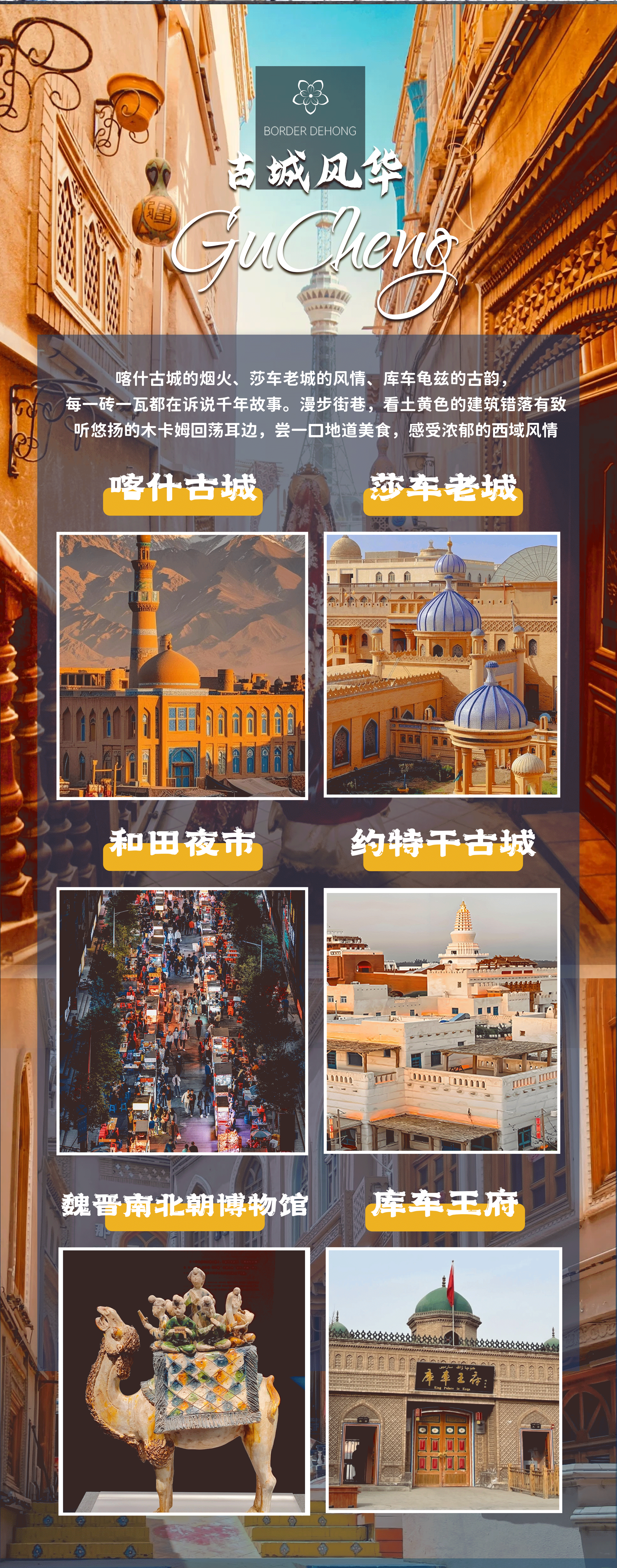 【喀什】喀什市是祖国最西部的一座边陲城市,古称疏勒,历史上是著名的“安西四镇”之一,是具有二千多年历史的古老城市。民族特色浓厚,享有“不到喀什,就不算到新疆”的美誉。