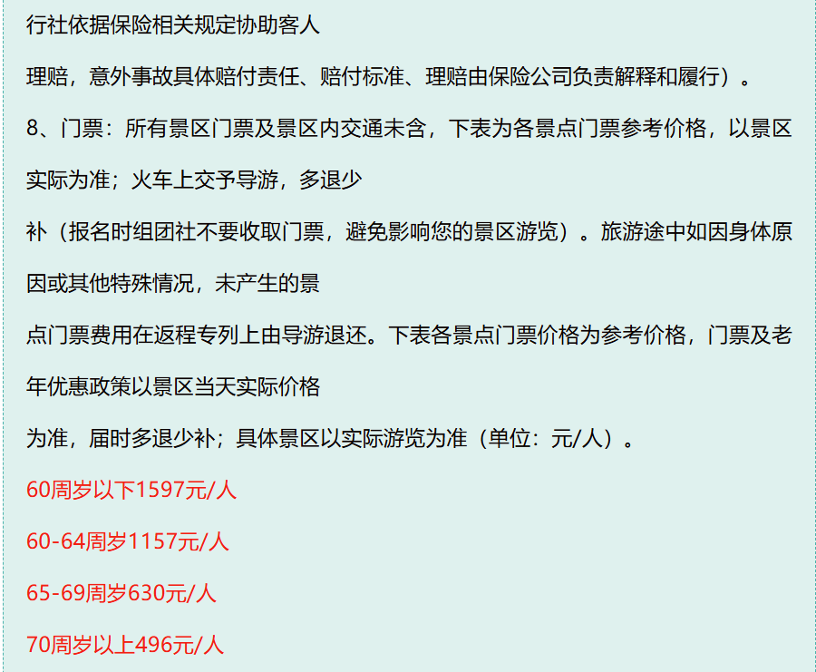 5、门票:所有景区门票及景区内交通未含,下表为各景点门票参考价格,以景区实际为准;火车上交予导游,多退少补。旅游途中如因身体原因或其他特殊情况,未产生的景点门票费用在返程专列上由导游退还(套票)。下表各景点门票价格为参考价格,门票及老年优惠政策以景区当天实际价格为准,届时多退少补;具体景区以实际游览为准。