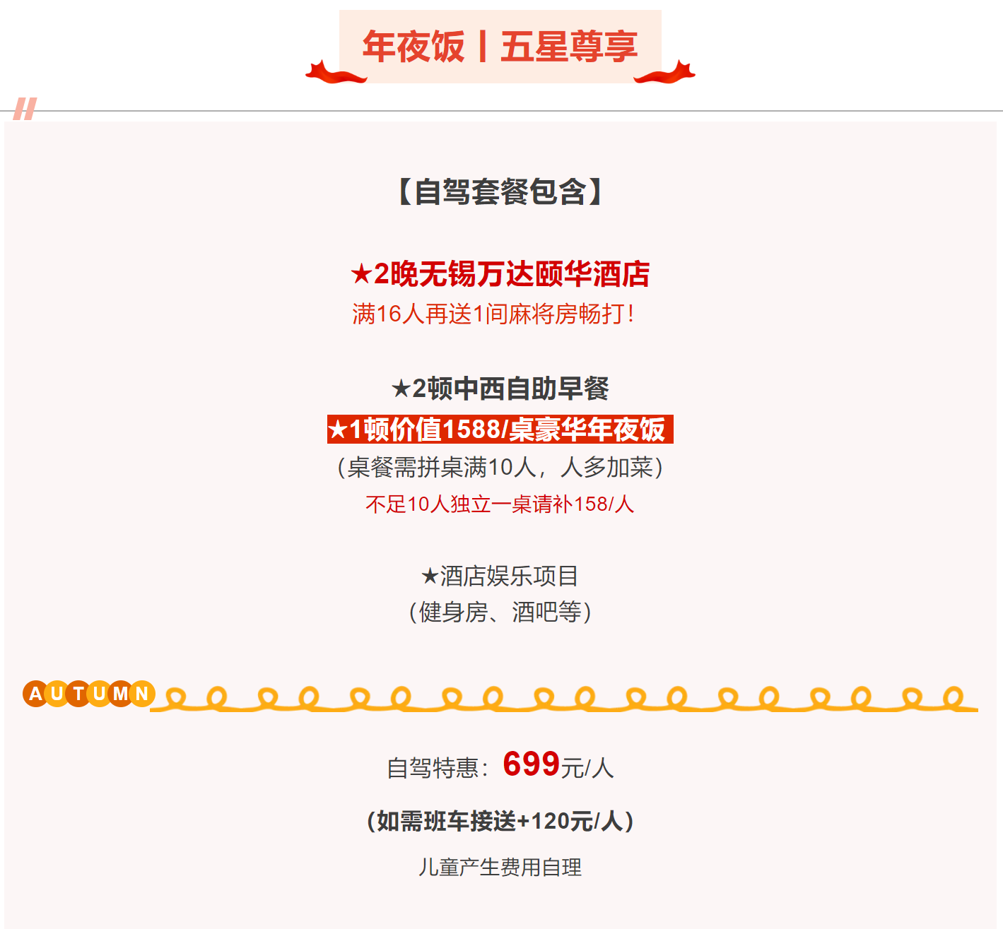 第一天:自驾前往无锡万达颐华酒店,抵达后办理入住(13:00后),下午自由活动,适时前往餐厅享用价值1588/桌豪华年夜饭,欢欢喜喜过大年!(含晚餐)