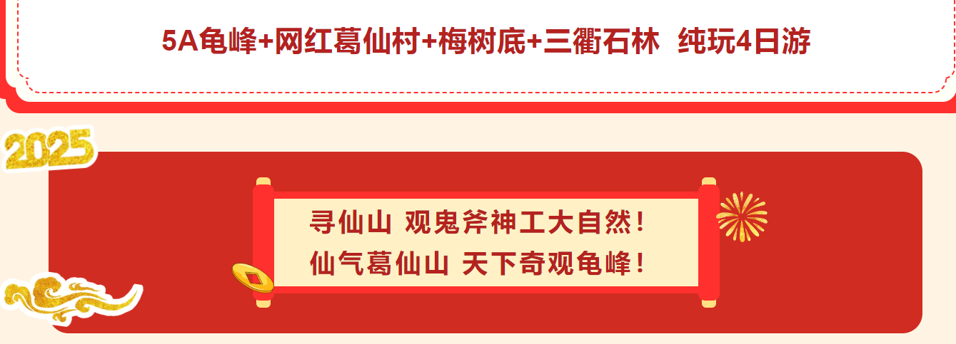早餐后,后前往游览-国家重点风景名胜区,AAAAA级景区,世界自然遗产,国家森林公园-【5A龟峰景区】(门票赠送,景交20自理,游船80元/人赠送。游览约3.5H):龟峰因景区内有无数形态酷似乌龟的象形石和整个景区远远看去像一只硕大无朋的巨龟而得名。素有“三十六峰七十二景”之说,集“奇、险、灵、巧”于一身,素有“江上龟峰天下稀”和“天然盆景”誉称。以其独特的“无山不龟,无石不龟”的自然景观和深厚的文化底蕴成为游圣徐霞客、电视剧《西游记》等众多名家名剧的推荐景点。游神龟迎宾、桂花园、三叠龟峰、老人峰、四声谷、将军楼、老鹰戏小鸡、好汉坡,观龟峰最高峰骆驼峰,探东方神龟乐园千姿百态的神龟之奇,结束后入住酒店休息。