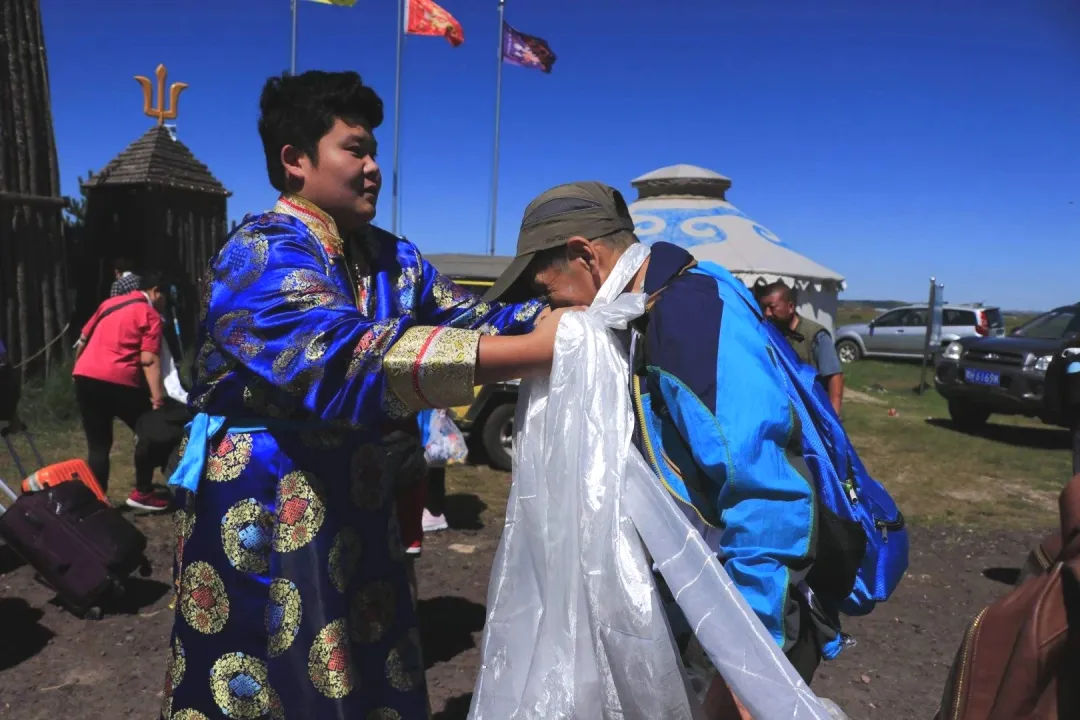 在草原上,牧民们捧着哈达,微笑着向我们走来。接过柔软的哈达带着祝福的温度。