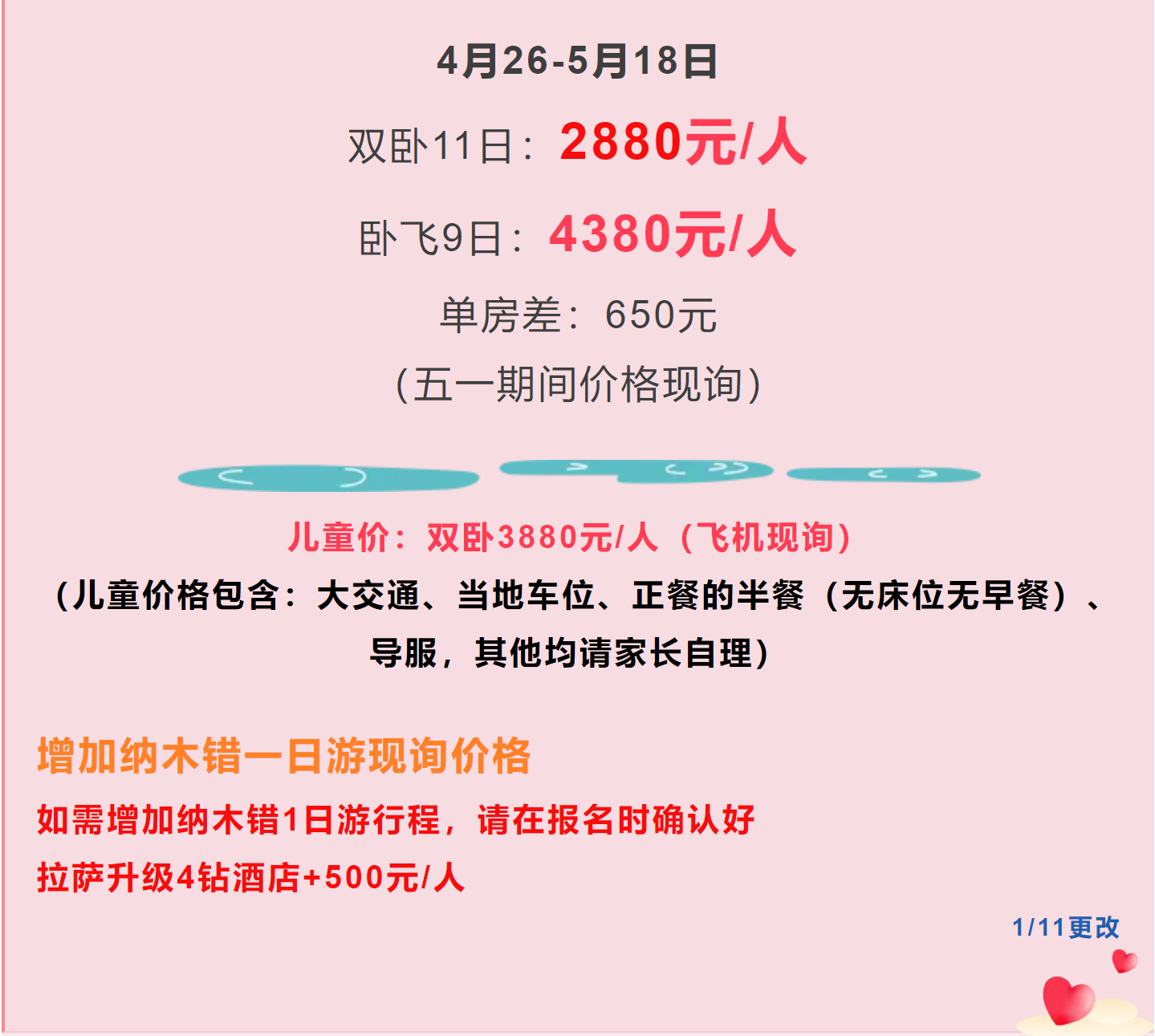 11、机票、酒店、旅游车等费用根据日期随时变动,因游客报名参团的早或迟会导致与其他同团参团人员价格有高有低,不接受此类投诉