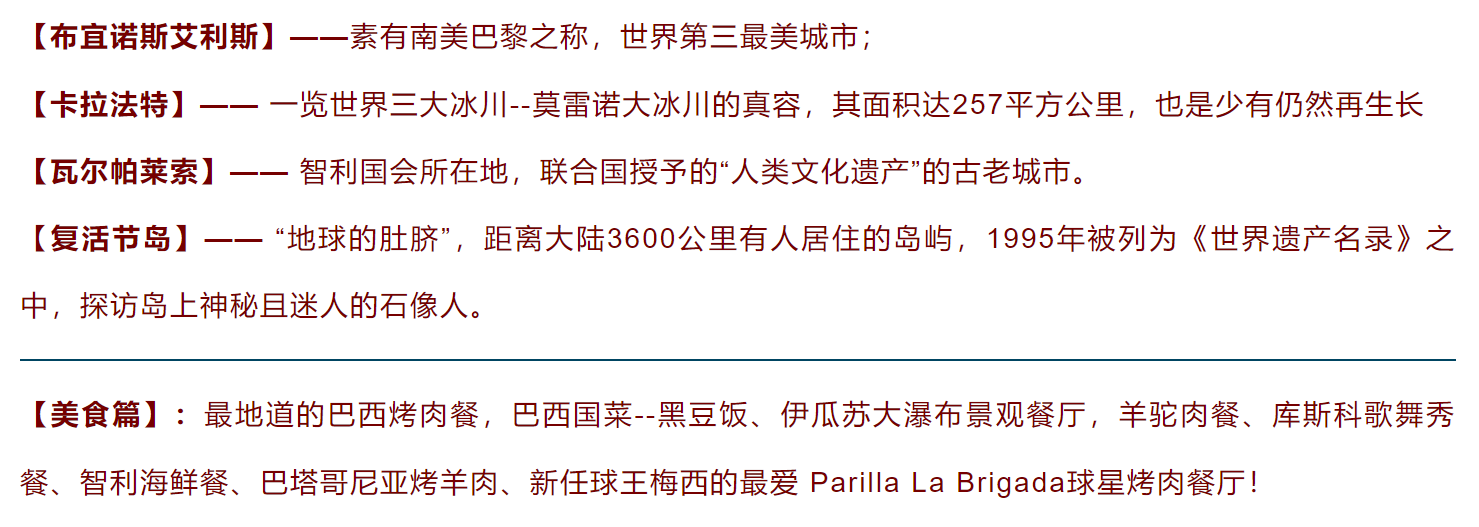 备注:以上行程和航班均为参考,具体出团行程以出团前最后确认航班为准!因为拉美内陆段飞机段数较多,而且基本为散客机位,随订随售,很难控制!因此最终我们会根据实际内陆航班预定及出票情况而调整行程,可能有些段会涉及转机,原则上我们尽量安排直飞。城市的顺序有可能会变更,但是城市及相关的景点不会少!导游也有权根据在行程进行中的现实情况调整景点的顺序!请各位游客予以谅解!