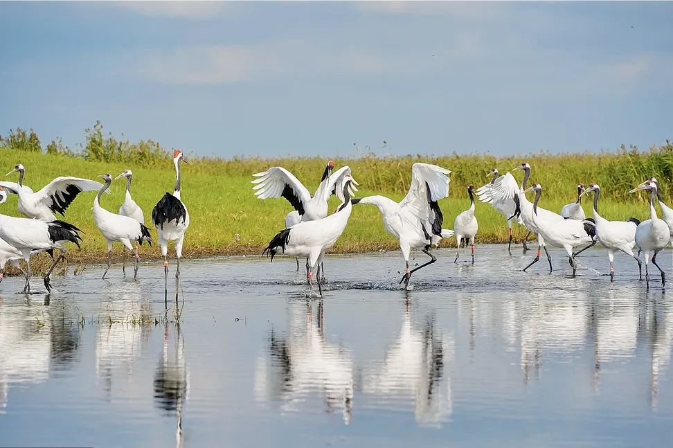 早餐后,游览世界自然奇观【红海滩】,是独一无二的"世界红色海岸线",火红的海滩,这里是闻名世界的丹顶鹤之乡,黑嘴鸥之乡。这里被称为“世界红色海岸线”、“中国最精彩的休闲廊道”、“中国最浪漫的户外游憩海岸线”;红海滩四月初为嫩红,渐次转深,十月由红变紫,最佳观赏时间为五月至十月。这里鱼肥蟹美,稻米飘香,海鸥与抽油机为伴,红海滩与丹顶鹤相映。参观【红海滩湿地科学馆】被中国国家地理杂志评为“中国最美的六大沼泽湿地”;2013年,被中央电视台等评为“中国十大魅力湿地”。红海滩湿地科学馆以辽河三角洲独特的红海滩湿地为依托,通过动静态展示辽河口湿地环境和保护工作,红海滩湿地科学馆被评定为全国科普教育基地;乘车赴世界第一大芦苇荡【苇海-蟹滩湿地】,位于辽河与绕阳河交汇之三角洲,属亚洲第一大苇荡一隅。仅此,足可纵观被科学家喻为“地球肾脏”的滨海湿地之独特自然生态景观——苇海蟹滩——芦苇酿绿,鹤汀凫情,长河潮汐,群蟹逢迎等妙趣横生之景象。苇海蟹滩纵横阡陌的万亩林带、纯净丰饶的辽河水资源,集聚鸟类二百余种,纷纷然万余只,有闻名遐迩的盘锦粳冠牌有机大米、中华绒螯蟹、文蛤和河豚鱼,后乘专列赴哈尔滨。