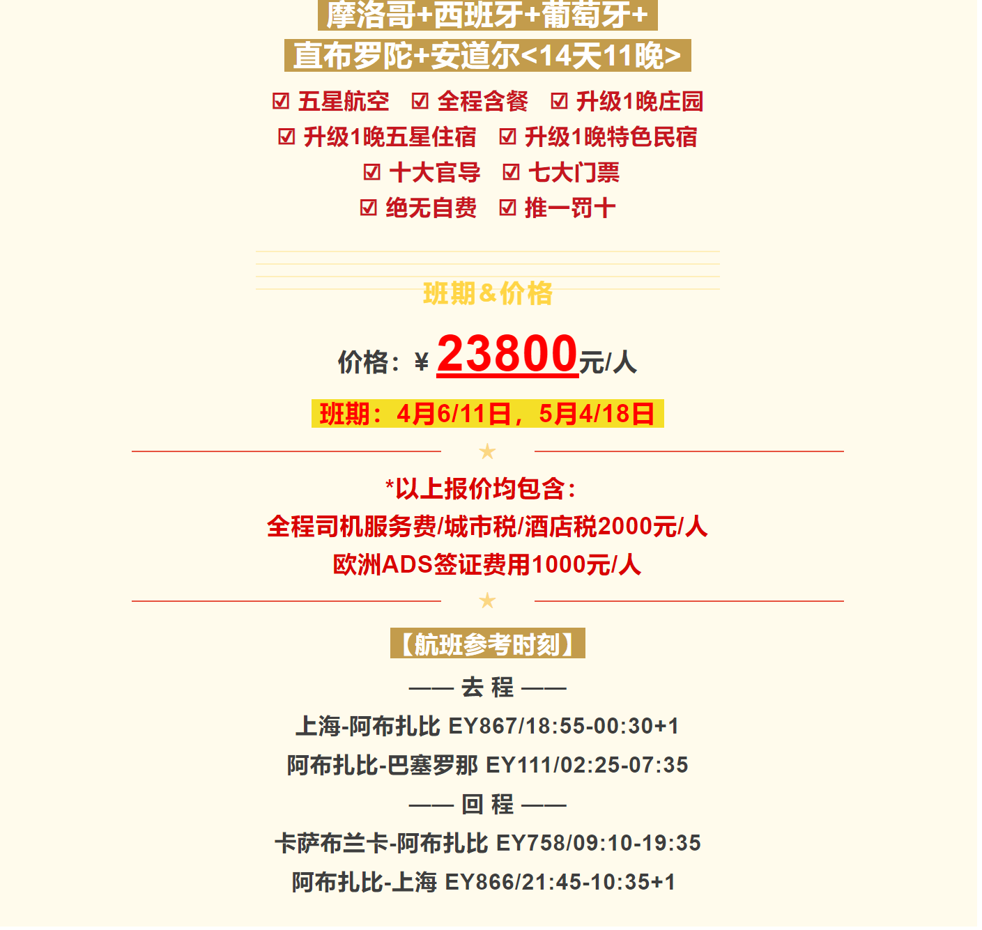 【门票】行程中所列景点标★符号(龙达官导,托莱多官导,马德里皇宫含官导,圣家族大教堂含官导,奎尔公园含官导,阿尔罕布拉宫花园含官导,弗拉明戈表演含饮料一杯、圣米盖尔岩洞、非洲之洞含官导、古兰经学院含官导、哈桑二世清真寺含官导)入内参观,其余均为外观;