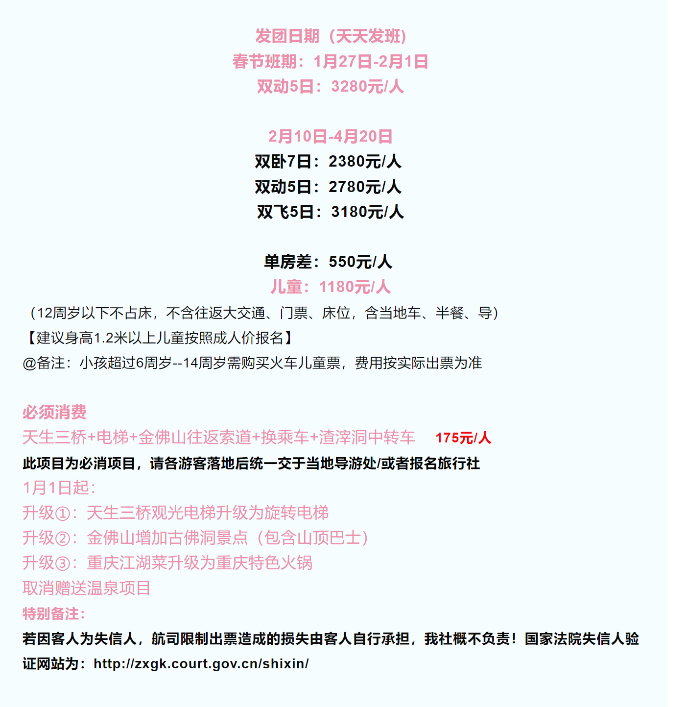 必消:行程不含景区门票+景区内交通车:武隆天生三桥换乘车+乌江画廊船票+综合服务费。