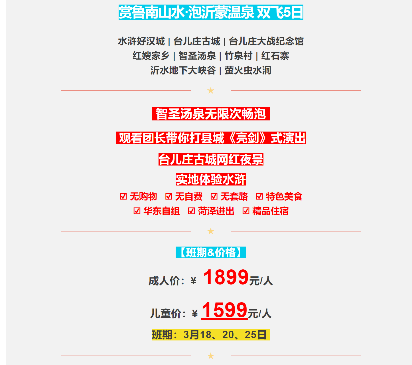 6. 必选自费(需与团费一同支付):体验跟着团长打县城+无限次温泉体验+升级3顿特色餐+台儿庄环保车+沂水地下大峡谷环保车+萤火虫水洞摆渡车=399元/人;
