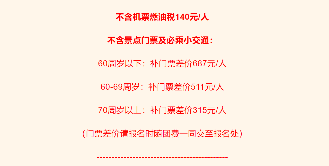 2、全程景点门票及必乘小交通请根据年龄选择自理,年龄精确到年/月/日核算。请报名时随团费一同缴纳:
