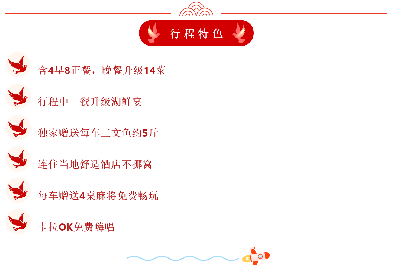 ☆用餐:全程含4早8正餐(晚餐升级14菜一汤,其中一餐湖鲜宴和一餐三文鱼宴,不满10人按比例减菜,所有餐均为打包价,不吃不退,请知晓)
