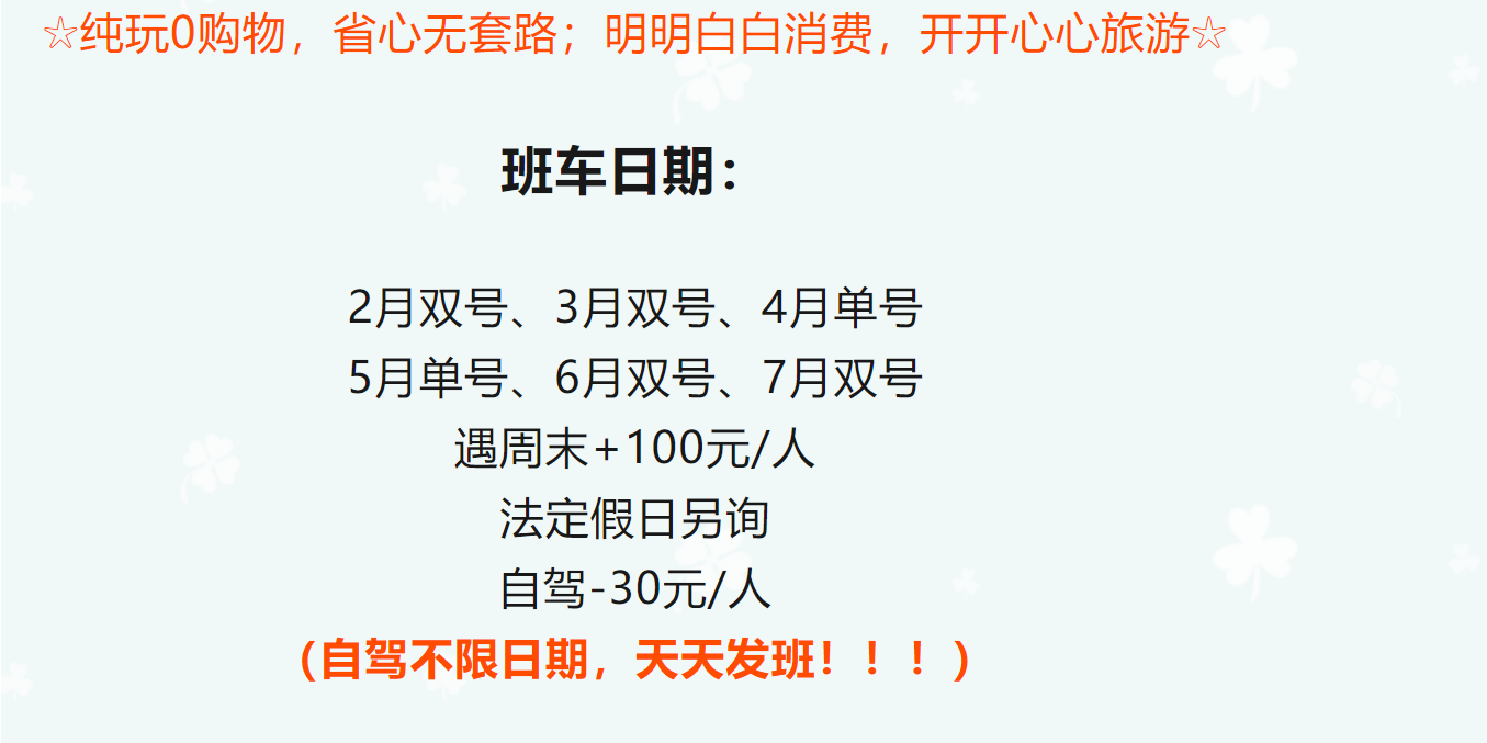 备注:强烈建议自觉购买旅游保险5元/人起,否则后果由游客本人承担;工作人员有权调整景点与行程顺序,以实际安排为准