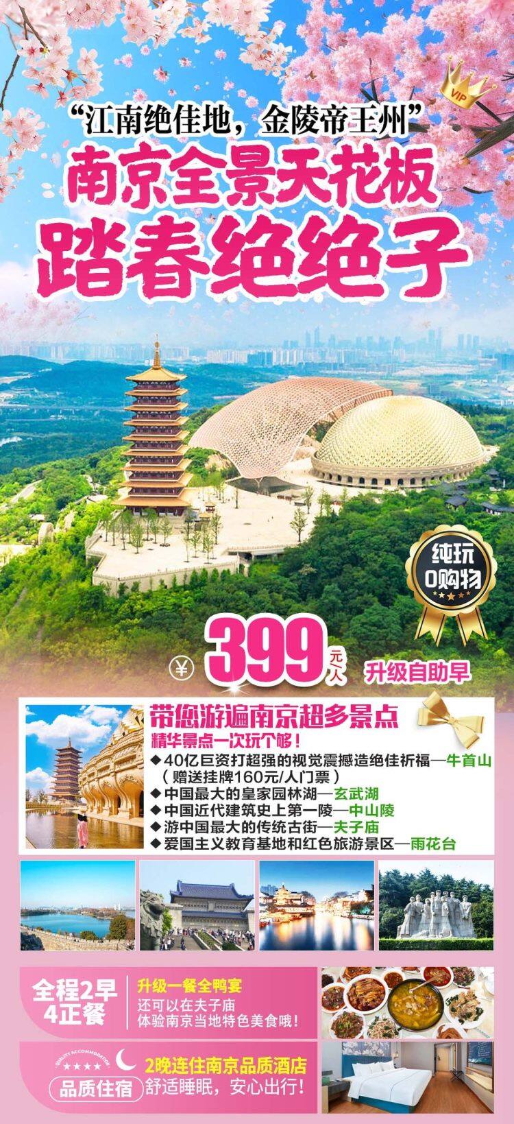 上海早6:45指定地点出发(具体地址以导游通知为准)前往南京,午餐(全鸭宴)后前往游览国家4A级旅游景区、网红打卡圣地——南京【牛首山】(含老年票,50周岁以下现补30元/人,游玩时间约2.5小时),牛首山位于南京市江宁区境内,牛首山是南京的主要山体之一,因双峰突起,东西对峙,形似牛头双角,故名“牛首山”。牛首山拥有丰富的人文资源,建有江苏省省级森林公园—牛首山森林公园,分布有佛顶寺、佛顶塔、佛顶宫、岳飞抗金故垒、摩崖石刻、弘觉寺塔、郑和文化园等相关人文景点。释迦牟尼佛顶骨舍利便供奉在牛首山的佛顶宫内。接着前往游览南京【雨花台】(游玩时间约45分钟),风景名胜区位于南京市雨花台区北部中华门外,占地面积153.7万平方米。雨花台风景名胜区是中国新民主主义革命的纪念圣地,是新中国规模最大的纪念性陵园,是全国重点文物保护单位、全国爱国主义教育示范基地、国家首批AAAA级旅游区和百家红色旅游经典景区,是一个集教育、旅游、休闲、娱乐为 一体的江苏省级纪念性风景名胜区。晚上夜游【夫子庙】(游玩时间约1小时),南京夫子庙位于南京市秦淮区秦淮河北岸贡院街、江南贡院以西,即南京孔庙、南京文庙、文宣王庙,为供奉祭祀孔子之地,是中国第一所国家最高学府,也是中国四大文庙,为中国古代文化枢纽之地、金陵历史人文荟萃之地,不仅是明清时期南京的文教中心,现为夫子庙秦淮风光带重要组成部分。晚餐(自理)后入住酒店休息(综合服务费50元/人必须自理,此费用报名时与团费一起收取)。