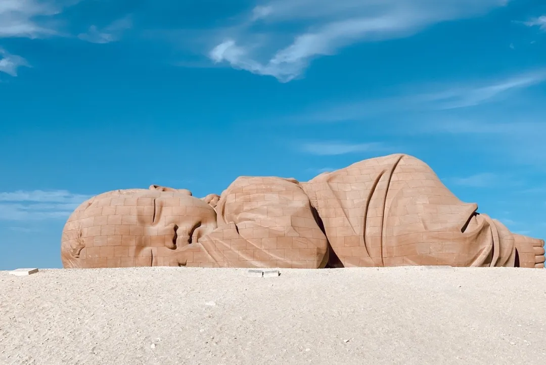 早餐后乘车前往嘉峪关途径瓜州游览戈壁雕塑艺术长廊,【戈壁方洲】【汉武雄风】【大地之子】是一处位于甘肃酒泉市瓜州县红山坡戈壁滩上的大型雕塑,但它与我们印象中的雕塑不太一样,并不是佛祖、菩萨或历史名人、神话等人物。而是一个大型婴儿的模样,而且这个婴儿非坐非卧,反而呈跪趴状伏在地上,一幅恬然入睡的安静模样。这片荒漠好像母亲的怀抱,让他安然入睡,这种带有强烈视觉效果的景象,令很多人都心生怜爱。