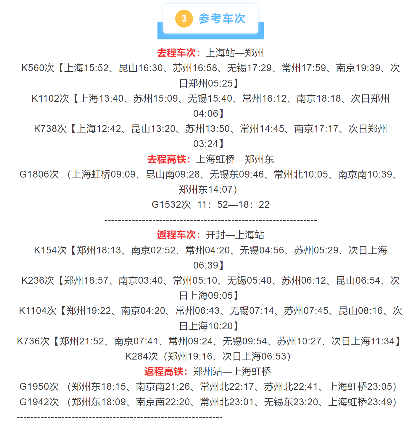 火车班:根据票面时间自行前往上海站乘坐火车前往郑州;