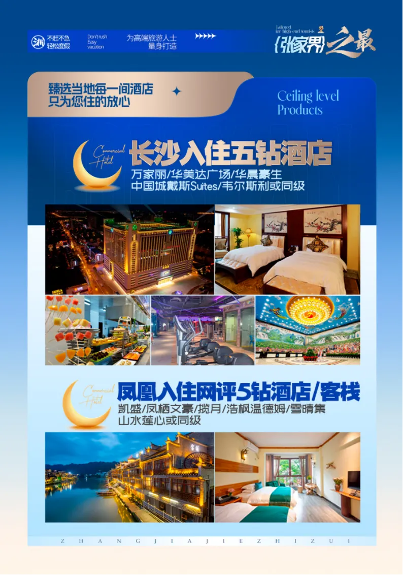 1、景区:橘子洲/韶山/天门山-玻璃栈道/芙蓉镇/张家界国家森林公园/宝峰湖/千古情贵宾座