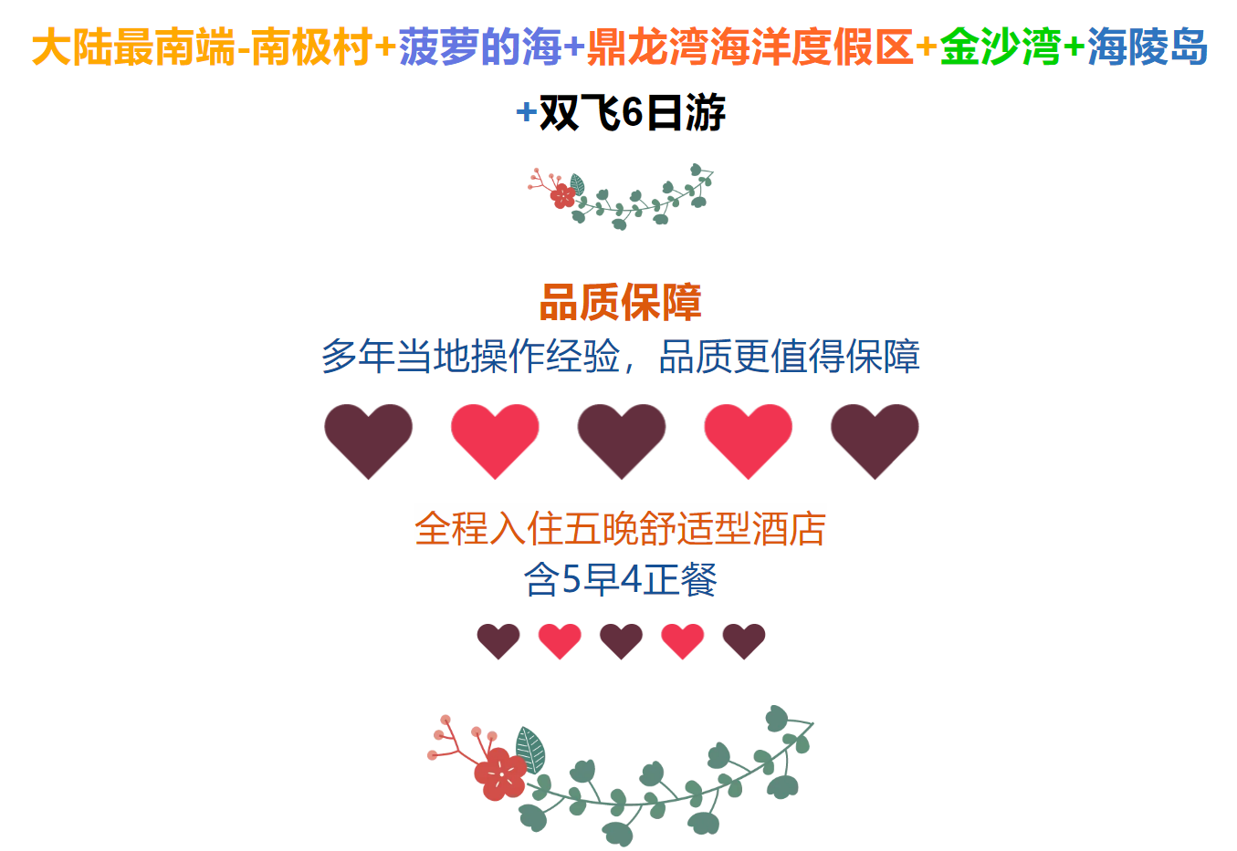 海陵岛一日游+南极村一日游+红嘴鸥游船或登军舰,(共计:999元,上海报名时一起付或当地交给导游!),必消项目,如不用一律不退,报名时随团费一起付!