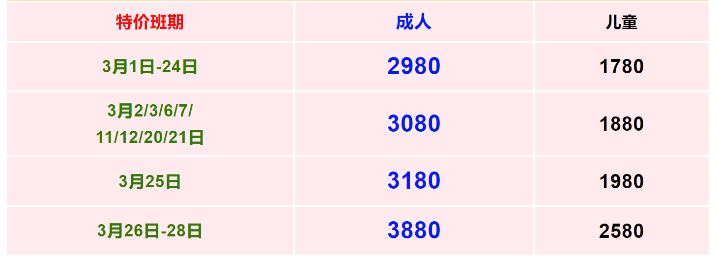 ③18岁以下不能直接按成人报名,按儿童价格含餐车+景+住宿价格报名(如18岁以下儿童按成人报名需+200元/人 )